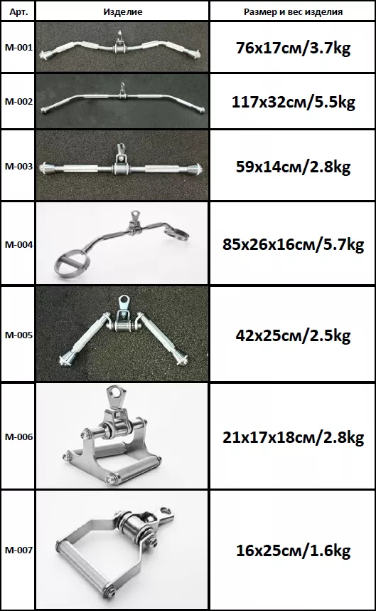 Ручки продаются комплектом из 7 штук. Общий вес комплекта 25кг. Покрыты хромом. Они помогают изолированно проработать отдельные мышцы и повысить эффективность тренажера для фитнеса. Упражнения с рукоятками способствуют формированию красивого рельефа тела, что особенно важно для бодибилдинга.